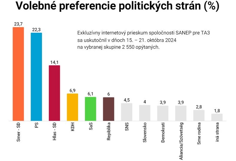 A parlamenti pártok tekintetében továbbra is a Smer vezet a PS és a Hlas előtt. Átlépné az 5 százalékos parlamenti küszöböt a KDH, az SaS és a Republika is.