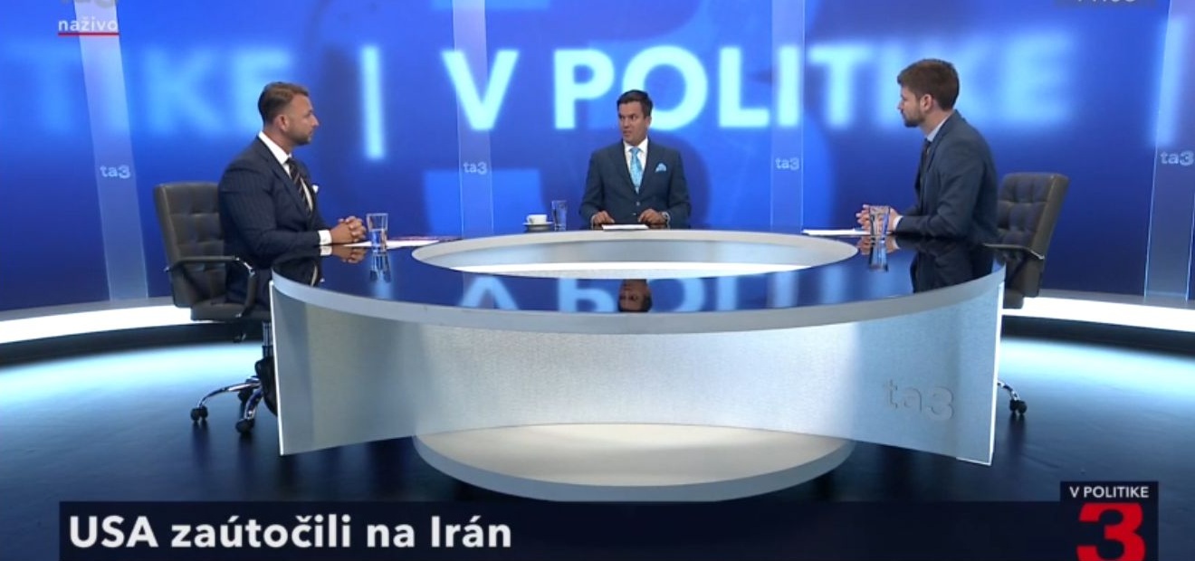 A műsor elején a beszélgetés a nemzetközi helyzetre, azon belül is az Irán és Izrael közötti feszültségre összpontosított. Šimečka kiemelte, hogy a jelenlegi regionális konfliktus akár globális méreteket is ölthet, és Szlovákia biztonsága szempontjából is komoly kockázatokat hordoz. Eštok egyetértett azzal, hogy a békés diplomáciai megoldás az egyetlen járható út, és hangsúlyozta, hogy Szlovákia NATO-tagsága kulcsfontosságú a jelenlegi biztonsági környezetben.