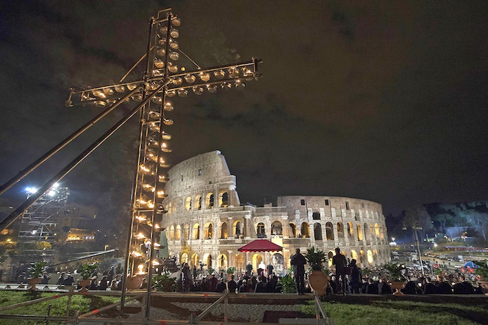 A Colosseum előtti tér teljesen megtelt a Via Crucist követő tömeggel. Ferenc pápa a Colosseummal szemközti Palatinus-domb teraszáról követi a stációkat, amelyek itt érnek véget.