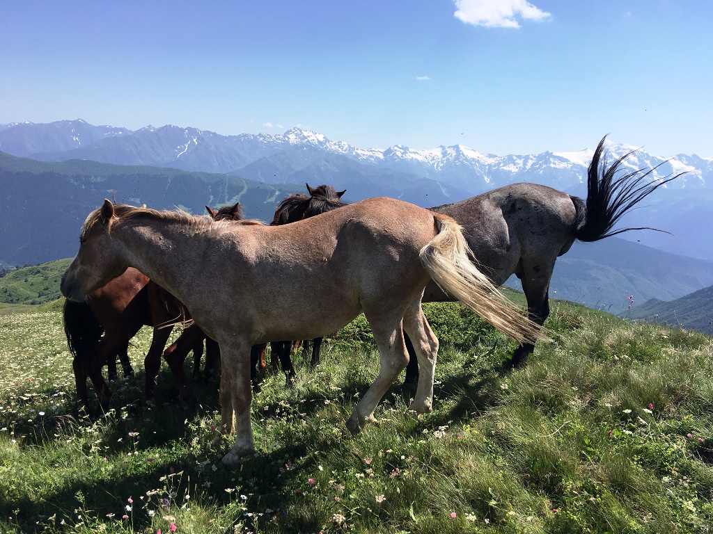 Ahogy haladunk felfelé, a táj egyre inkább megmutatja magát, egyre több 4000 métert meghaladó csúcs kerül elő. Valljuk be, mind közül az Ushba ikercsúcsa a legvonzóbb, szinte megbabonázza az embert a 4710 méter magas orom. De most nincs itt az ideje a csúcshódításnak, már az is óriási sportérték, ha ilyen melegben a Koruldi-tavakhoz felérünk egy 9 és egy 12 éves gyermekkel.