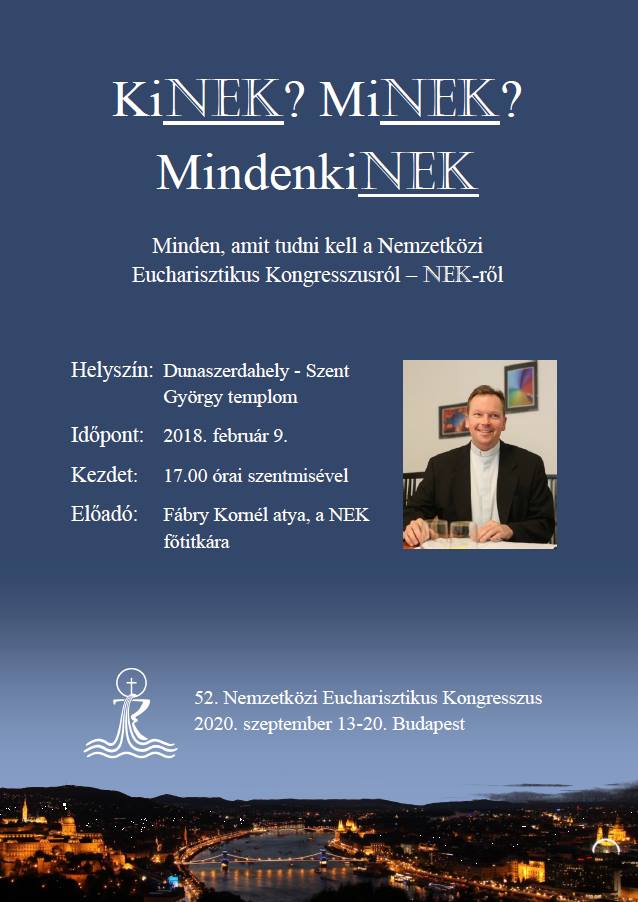 A dunaszerdahelyi Szent György templomban 2018. február 9-én, pénteken a 17.00 órakor kezdődő szentmise után Fábry Kornél atya, a NEK főtitkára előadást tart a majdani Nemzetközi Eucharisztikus Kongresszusról – NEK-ről.