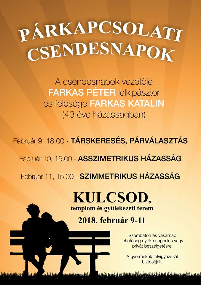 2018. február 9 – 11. között Párkapcsolati Csendesnapoknak ad otthont a kulcsodi templom és gyülekezeti terem. A napok során az érdeklődők megtudhatják, mit mond Isten igéje a különböző párkapcsolati élethelyzetekre. Szombaton Molnár Lajos rétei gondnok és felesége énekben elmondott bizonyságtételét, vasárnap pedig Károlyi József és felesége (Győr) hit nélkül megkötött házasságukról, a feleség, majd a férj megtéréséről és a folytatásról szóló bizonyságtételét hallgatják meg a jelenlévők.