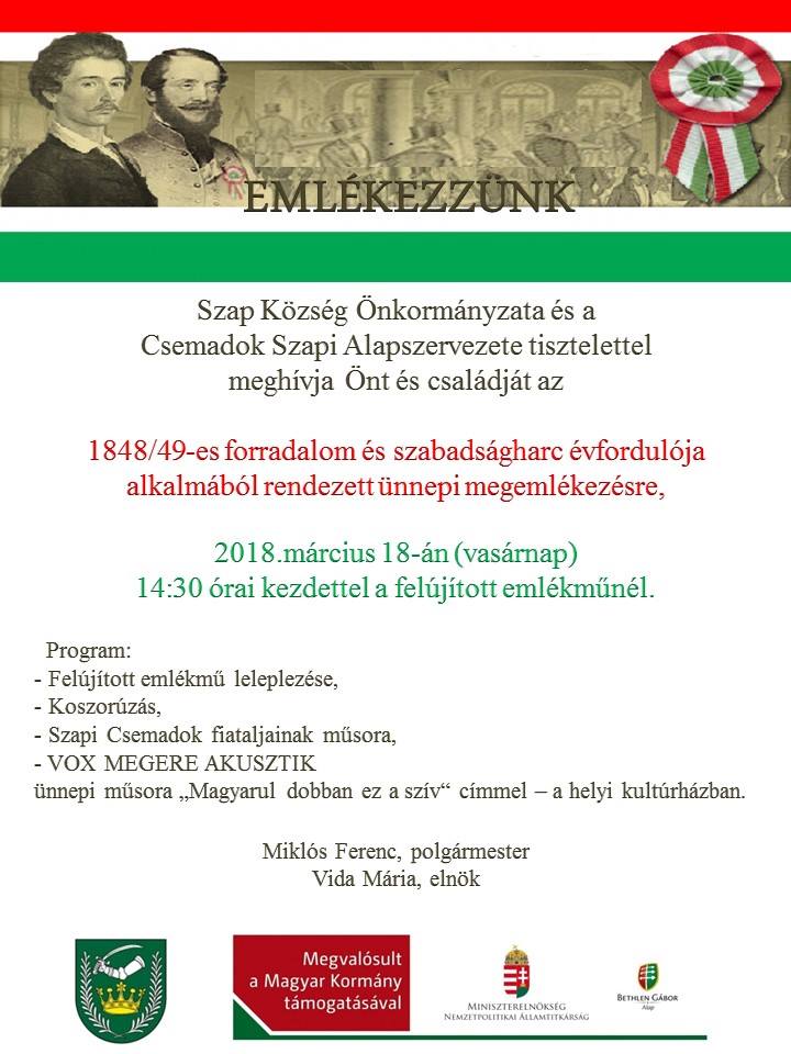 Szapon március 18-án, vasárnap 14.30 órai kezdettel a felújított emlékműnél egy ünnepi megemlékezés keretén belül tisztelegnek az 1848/49-es forradalom és szabadságharc hősei előtt.