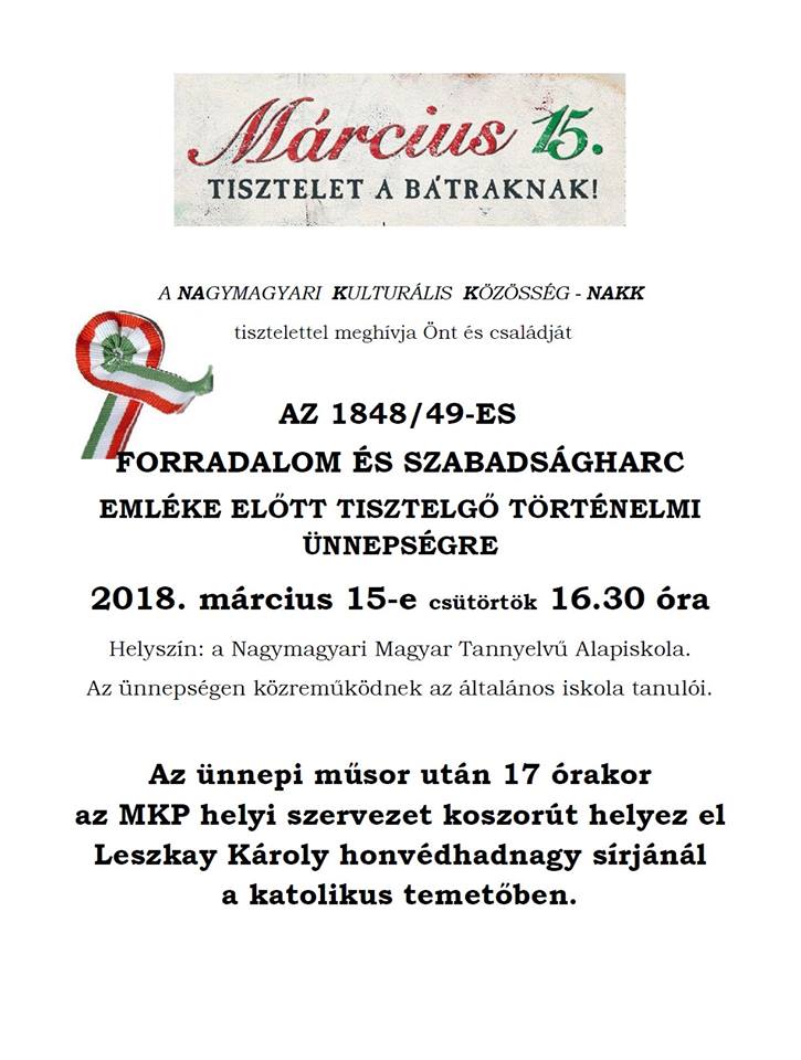A Nagymagyari Kultúrális Közösség – NAKK szervezésében március 15-e, csütörtök 16.30-kor az 1848/49-es szabadságharc és forradalom emléke előtt tisztelgő történelmi ünnepségre kerül sor a helyi alapiskolában, mielőtt a tisztelet koszorúit elhelyezik a Leszkay Károly honvédhadnagy sírjánál a katolikus temetőben.