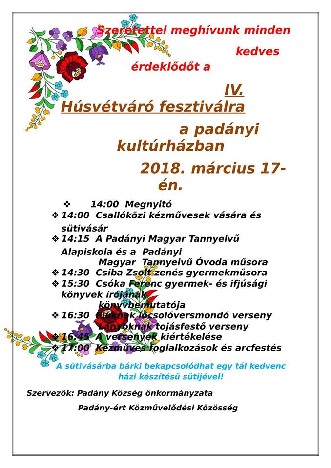 Padány Község Önkormányzata és a a Padány-ért Közművelődési Közösség március 17-én, szombaton 14.00 órai kezdettel Húsvétváró fesztivált szervez a helyi kultúrházban.
