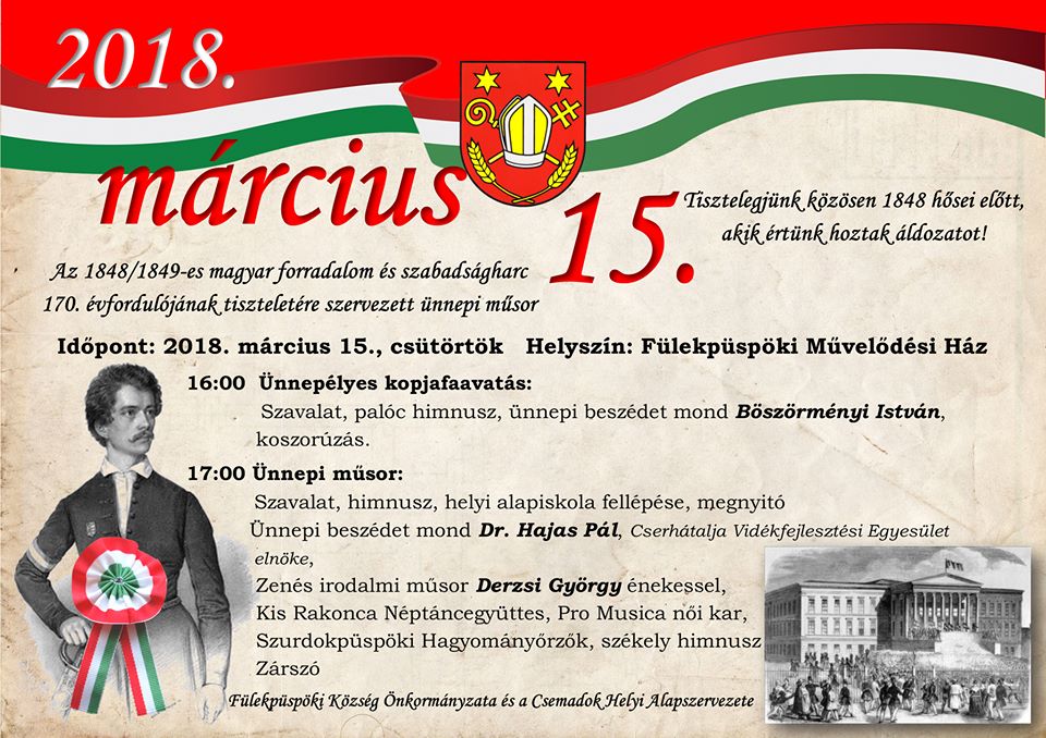 március 15., 16.00 óra Fülekpüspöki, Művelődési Központ,