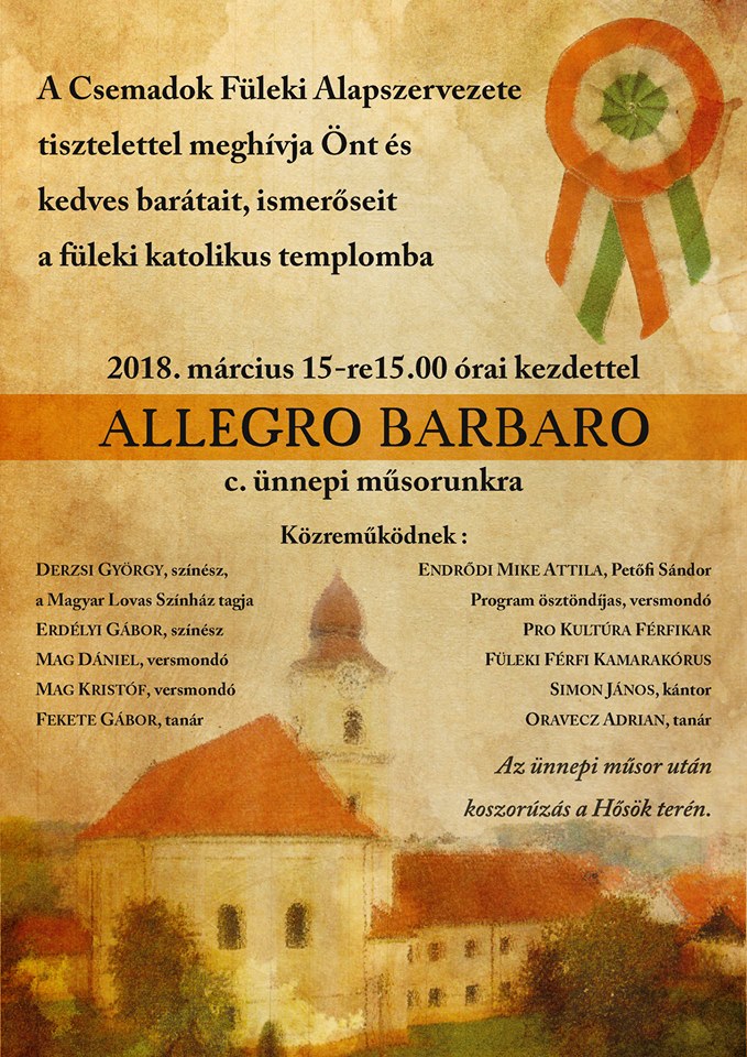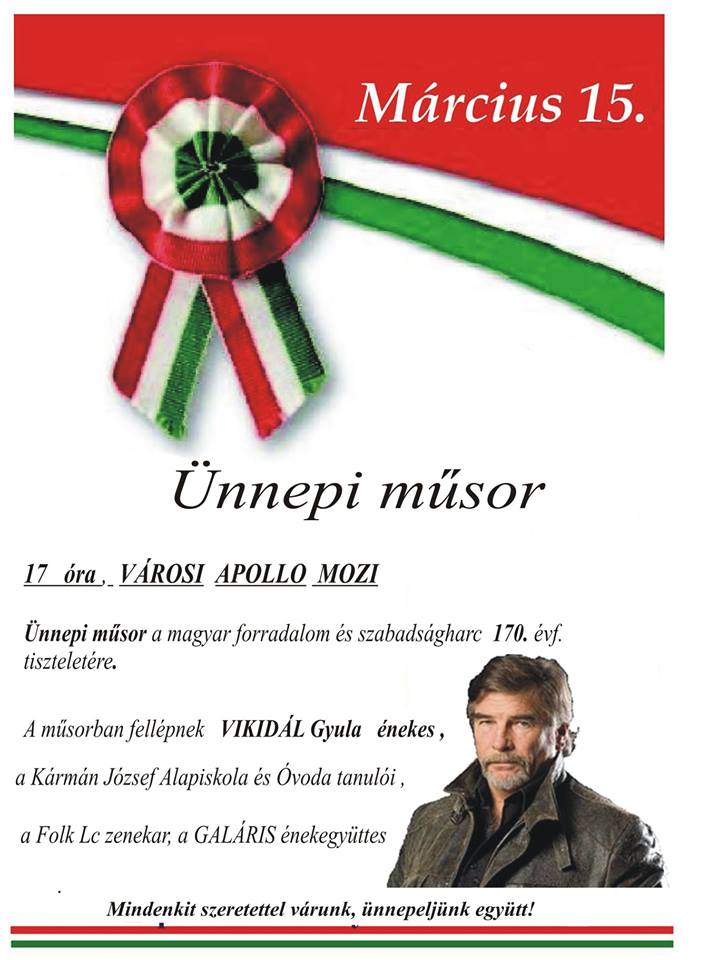Március 15-i ünnepi műsor. Fellépnek Derzsi György (Magyar Lovas Színház), Erdélyi Gábor, Mac Gábor és Kristóf, Fekete Gábor, Endrődi Mike Attila, valamint a Pro Kultúra Férfikar, a Füleki Férfi Kamarakórus, Simon János, Oracecz Adrián.