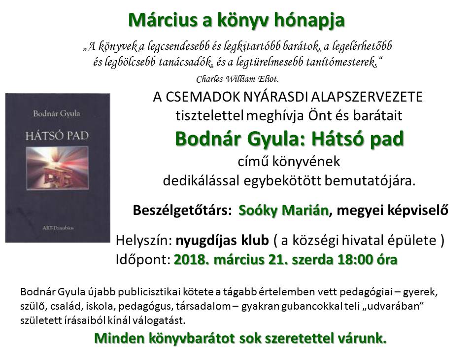 Nyárasdon március 21-én, szerdán 18.00 órai kezdettel író-olvasó találkozóra kerül sor. Bemutatják Bodnár Gyula legújabb könyvét, az író beszélgetőpartnere Soóky Marián (MKP) nagyszombat megyei képviselő.