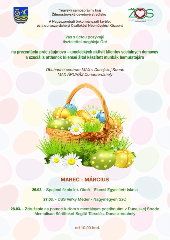 A dunaszerdahelyi MAX bevásárlóközpontban március 26-án, március 27-én és március 28-án, hétfőn, kedden és szerdán a járás szociális otthonai klienseinek munkáiból tekinthető meg kiállítás.