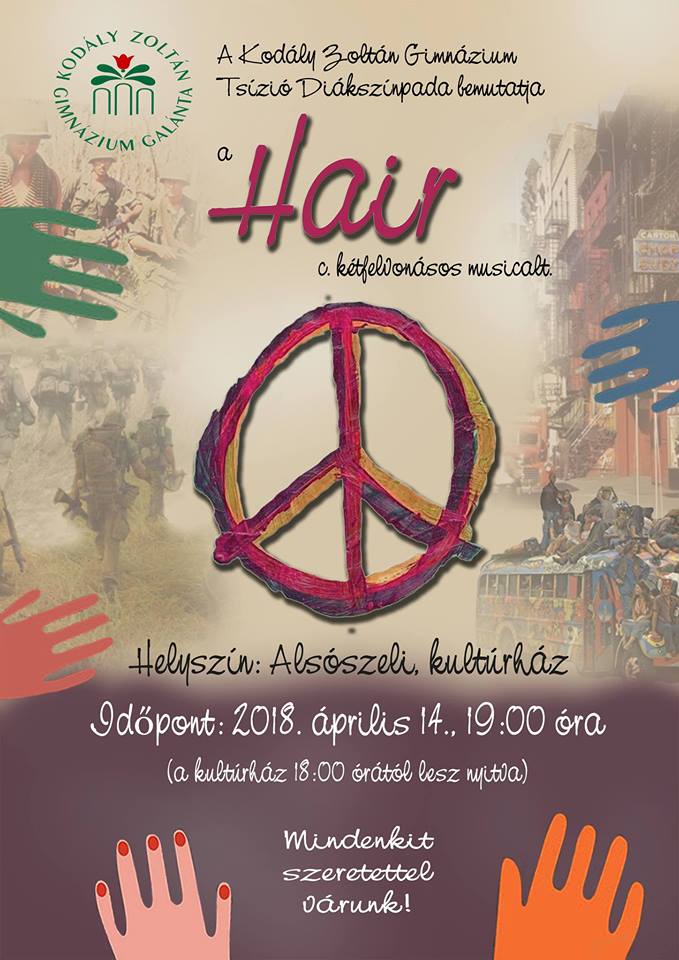 Alsószeli községben április 14-én, szombaton 17.00 órakor a Tsízió Diákszínpad bemutatja a HAIR-t a helyi kultúrházban.