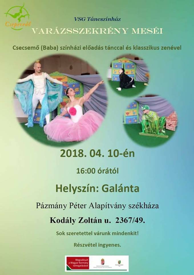 A Pázmány Péter Alapítvány székházában április 10-én, kedden 16.00 órakor a VSG Táncszínház Varázsszekrény meséi c. csecsemő (baba) színházi előadás tánccal és klasszikus zenével kerül bemutatásra.