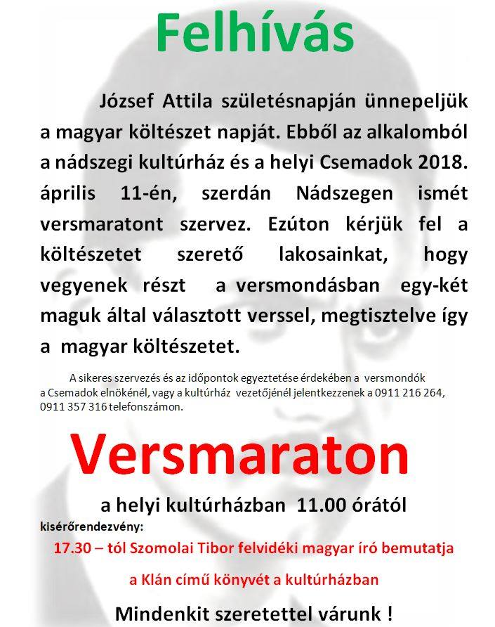 Nádszeg községben a költészet napját Versmaratonnal ünneplik április 11-én, szerdán 11.00 és 17.00 óra között.