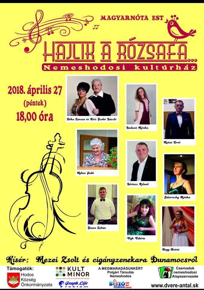 A nemeshodosi kultúrház április 27-én, pénteken 18.00 órától Hajlik a rózsafa címmel magyar nótaestnek ad otthont.