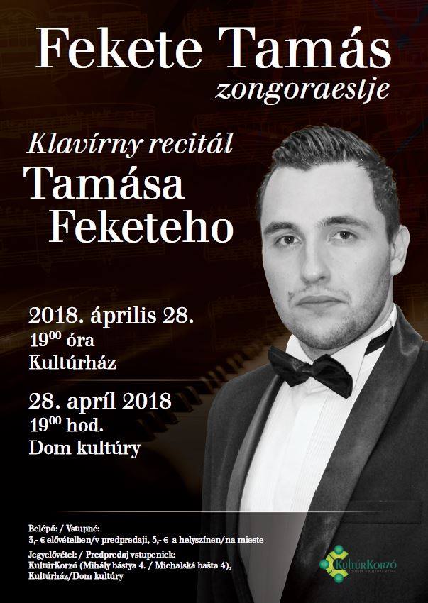 Az érsekújvári kultúrházban április 28-án, szombaton 19.00 és 21.00 óra között Fekete Tamás zongoraestje lesz.