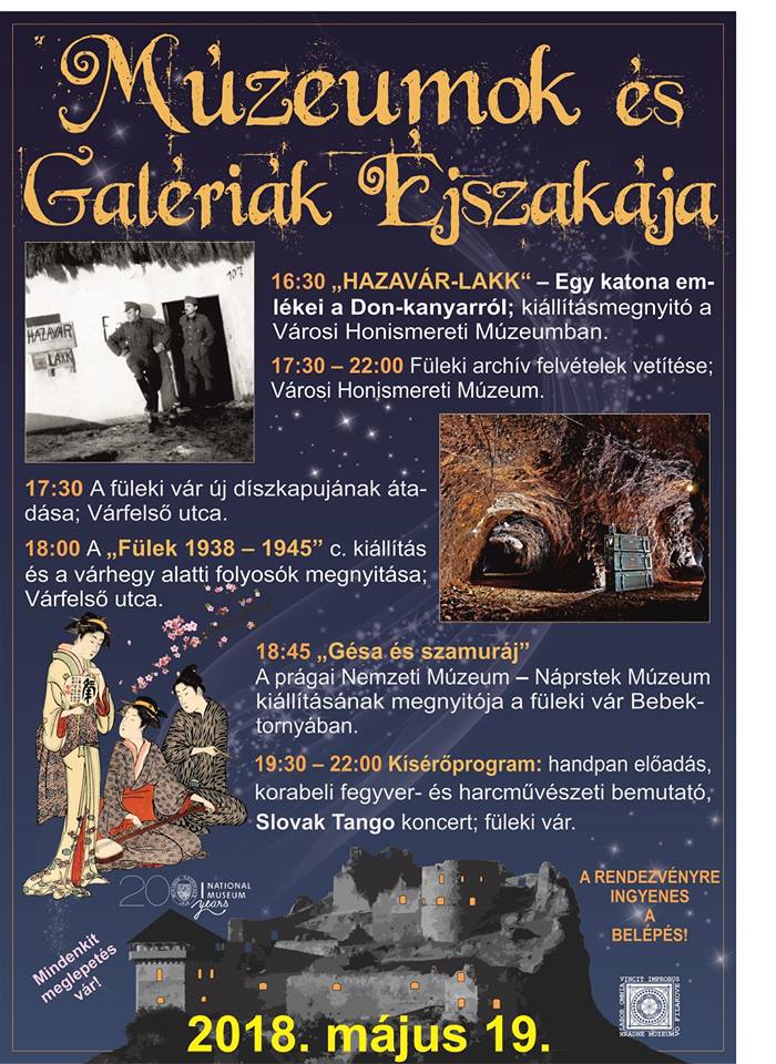 A Füleki Vármúzeum 11. alkalommal csatlakozik a Múzeumok és Galériák Éjszakája elnevezésű összeurópai rendezvényhez. A füleki vár új, történelmi eseményeket ábrázoló, bejárati díszkapuval gazdagodik. A legizgalmasabbnak a várhegy oldalában található, földalatti légoltalmi óvóhelyek megnyitása ígérkezik.