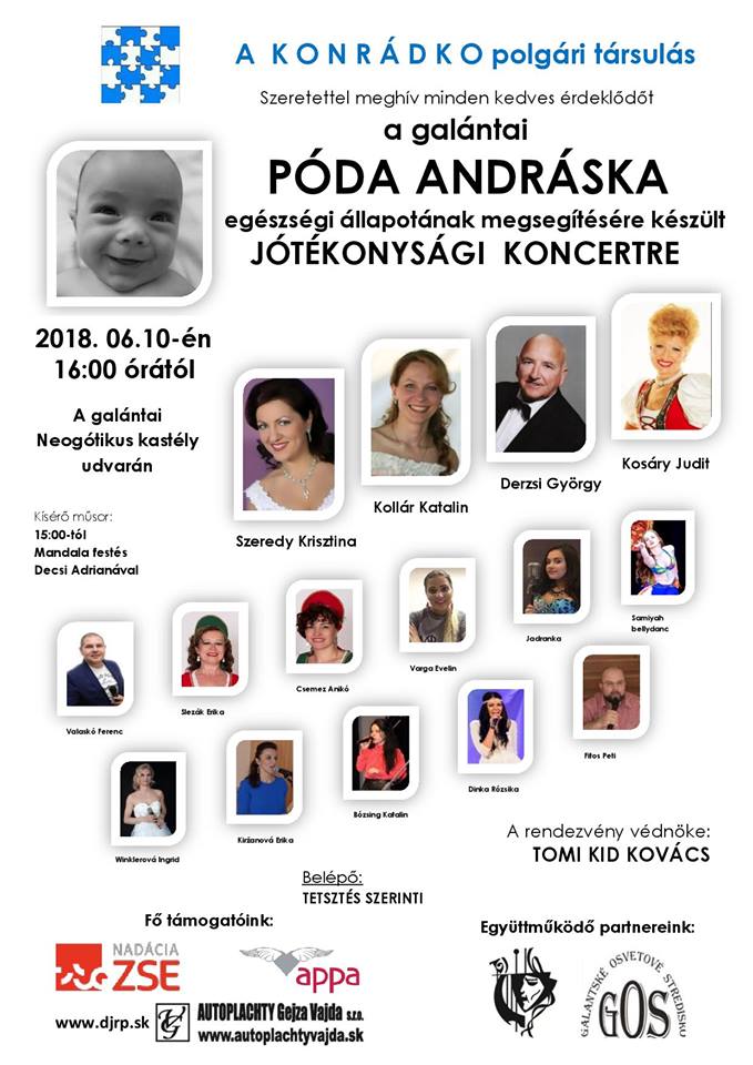 A galántai neogótikus kastély udvara június 10-én, vasárnap 16.00 órától Póda Andráska gyógyulásának megsegítésére jótékonysági koncert helyszínéül szolgál.