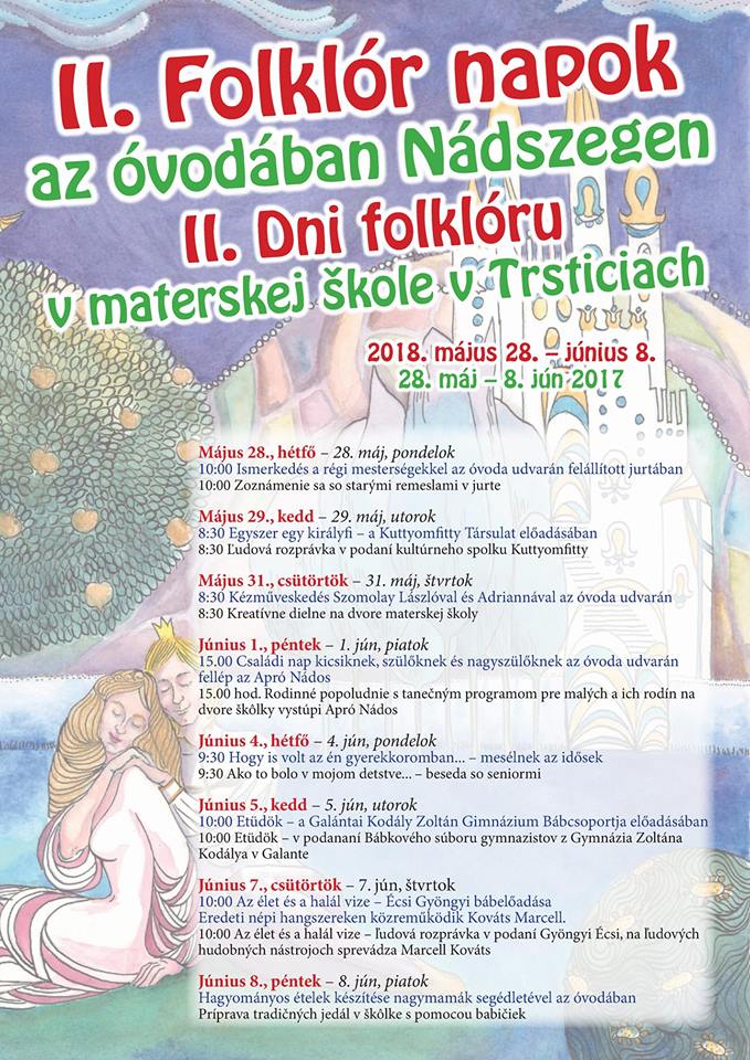 Nádszegen június 4-én, hétfőn 9.30-kor folytatódnak a II. Folklór napok a helyi óvodában.