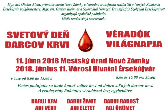 Érsekújvárott június 11-én, hétfőn 8.00 és 15.00 óra között a véradók világnapja alkalmából önkéntes véradás lesz.