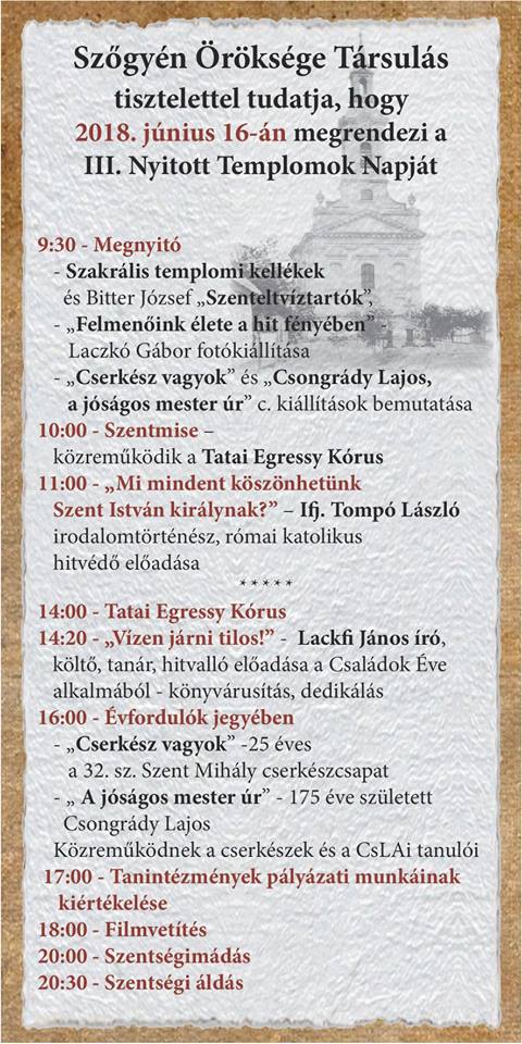 Szőgyénben június 16-án, szombaton 9.30-tól megrendezik a III. Nyitott Templomok Napját.