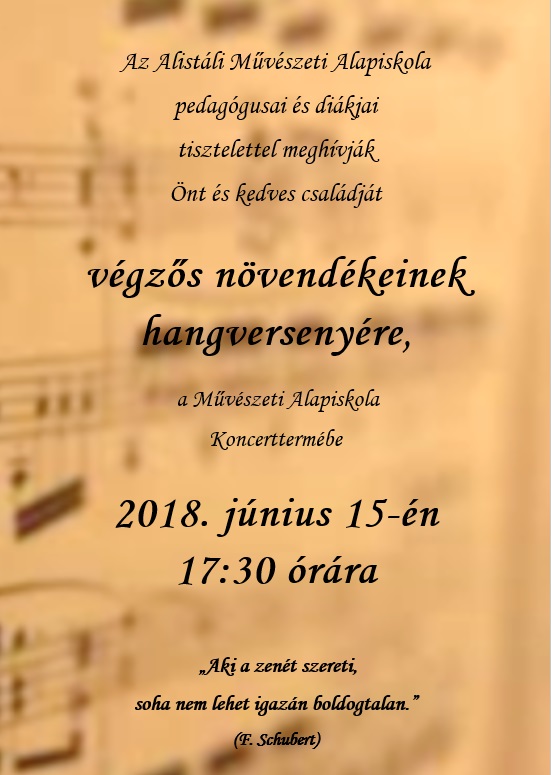 Alistál községben június 15-én, pénteken 17.30-tól a helyi művészeti alapiskola végzős diákjainak hangversenyére kerül sor.