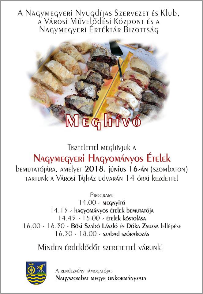 Nagymegyeren június 16-án, szombaton 14.00 órakor kezdődik a nagymegyeri hagyományos ételek bemutatója.