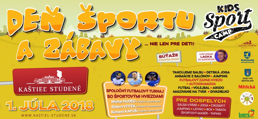 A szervezők a kicsiket és a nagyokat is egyaránt várják a július 1-jén, vasárnap megrendezésre kerülő sportnapra a hideghéti kastélyba (Kaštieľ Studené). Az egész napos programok között olyan sportolási lehetőségekkel várják az érdeklődőket, mint foci, röplabda, gyerekjóga, salsa, crossfit, jumping és még sok minden más. A vendégek között ott lesz: Robo Vittek, Richard Kapuš és Michal Hudec. A rendezvényen a superstaros Lacko Angyal is szórakoztatni fogja a nagyérdeműt.