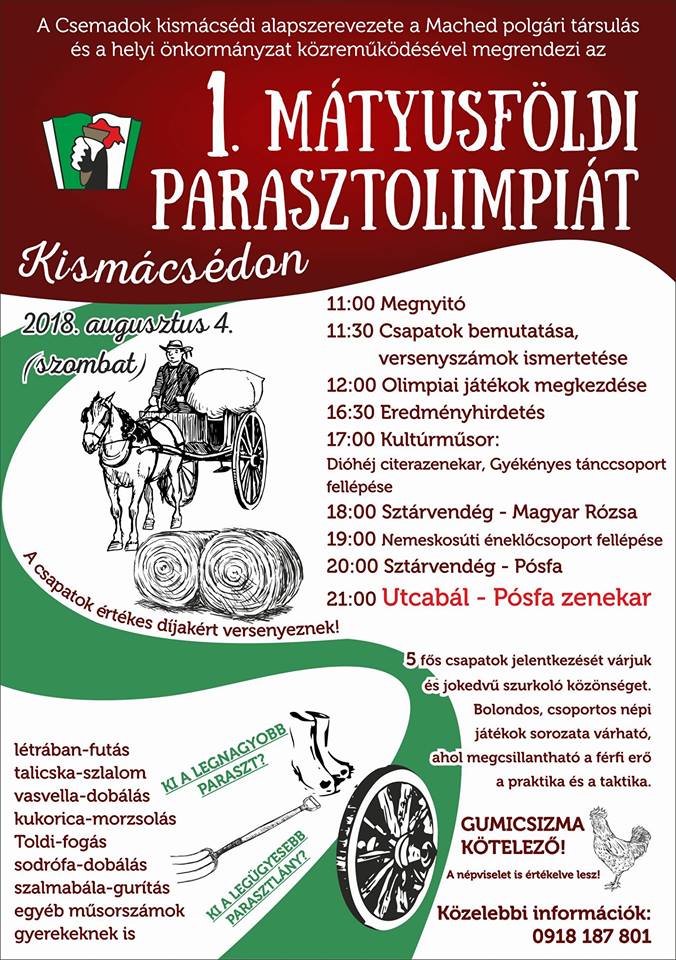 Kismácséd községben augusztus 4-én, szombaton 11.00 órakor kezdődnek az 1. Mátyusföldi Parasztolimpia programjai. Kultúrműsorok kíséretében olimpiai játékokkal várnak mindenkit. A gumicsizmát ne hagyja otthon!