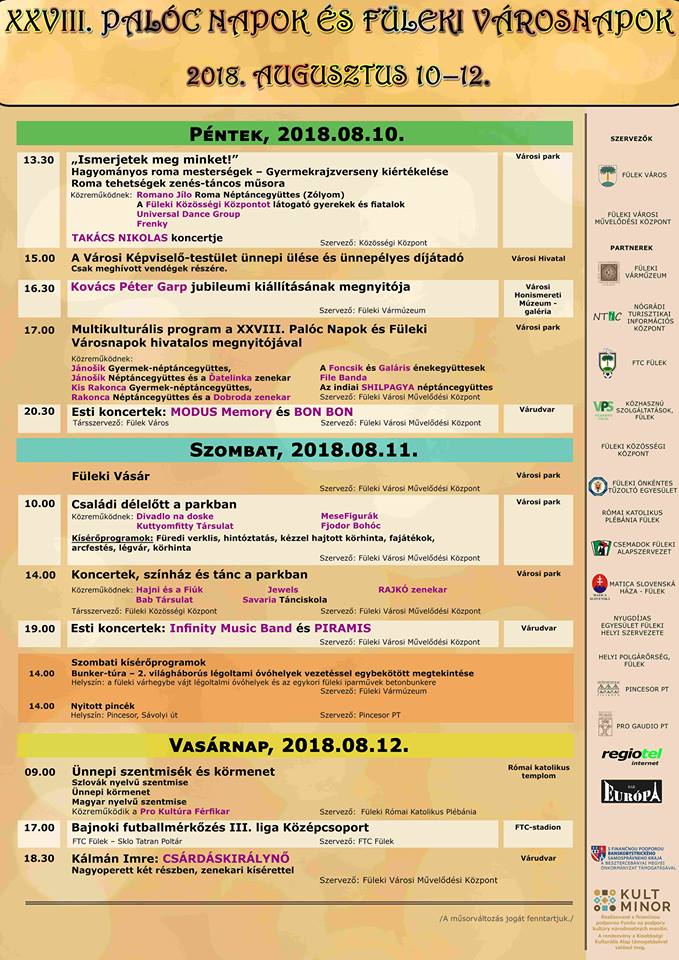 Fülek város önkormányzata és a Városi Művelődési Központ 28. alkalommal rendezi mega Palóc- és Városnapokat, amely az idén is gazdag programmal várja az érdeklődőket, melynek fő helyszíne a Városi Park lesz. A rendezvény keretében nyílik meg Kovács Péter Garp, képzőművész jubileumi kiállítása, a Városi Képviselő-testület ünnepi ülésén átadják a városdíjakat,. Lesz családi délelőtt, vásár, bunkertúra, több koncert, Csárdáskirályő c. operett bemutatója stb.