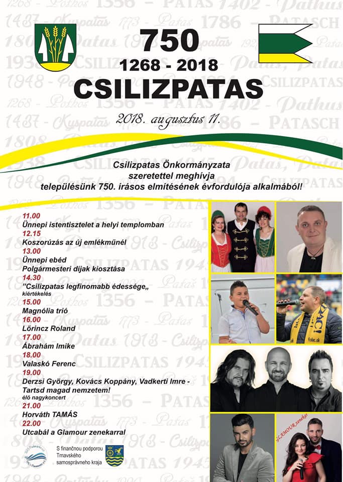 Csilizpatas községben augusztus 11-én, szombaton 11.00 órától a település írásos említésének 750. évfordulóját ünneplik.