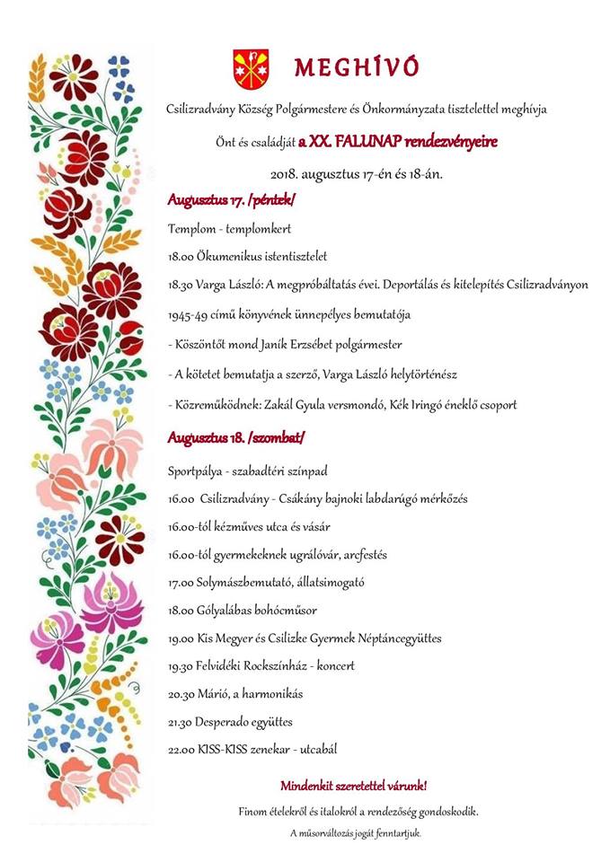 Csilizradvány községben augusztus 17. és 18. között tartják a 2018. évi falunapot.