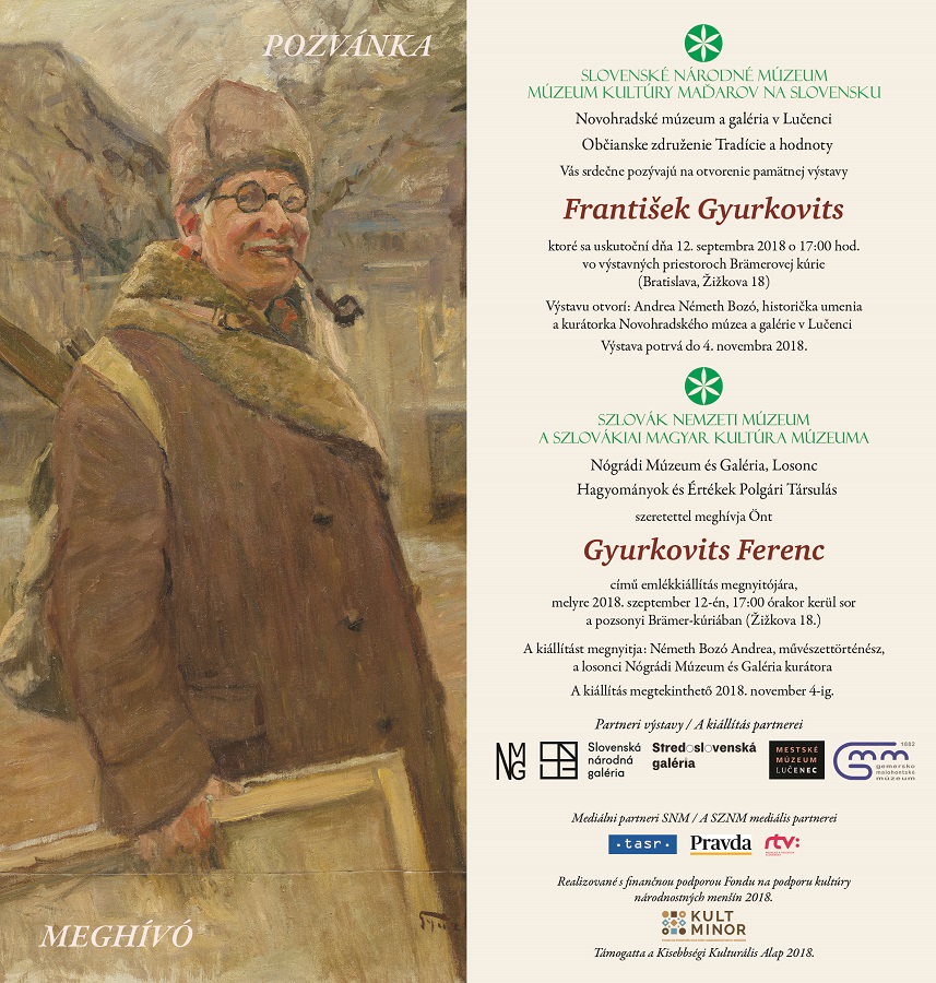 A Szlovák Nemzeti Múzeum – A Szlovákiai Magyar Kultúra Múzeuma a losonci Nógrádi Múzeum és Galériával valamint a Hagyományok és Értékek Polgári Társulással közösen szervezi meg szeptember 12-én, szerdán 17.00 órai kezdettel a Gyurkovits Ferenc című emlékkiállítást a pozsonyi Brämer-kúriában.