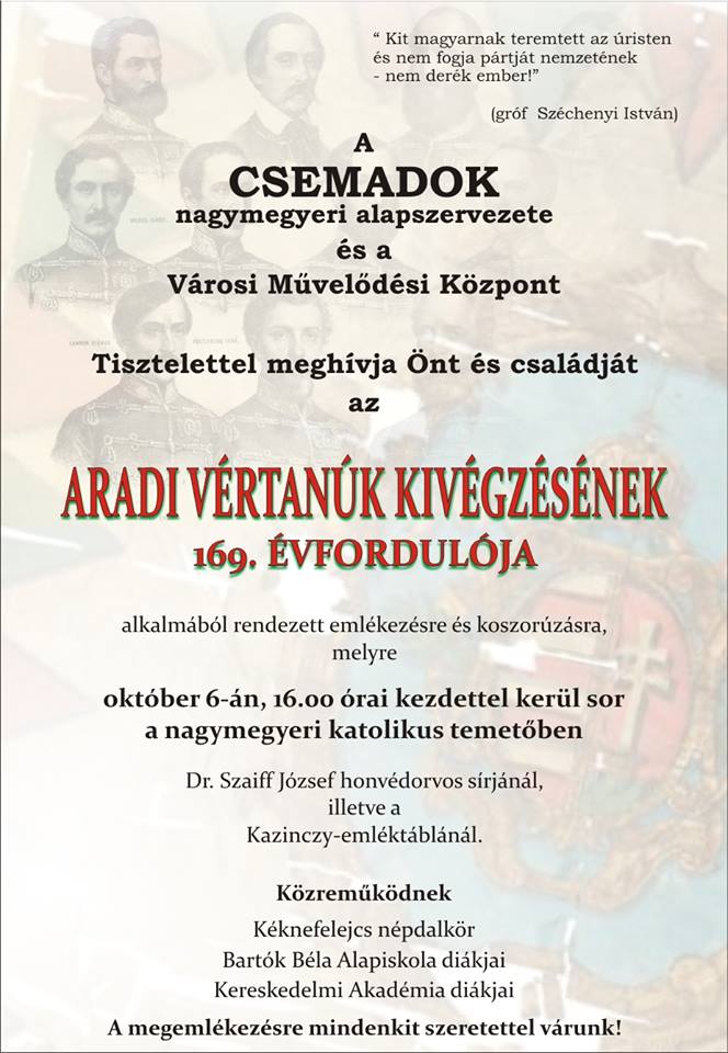 Nagymegyeren október 6-án, szombaton 16.00 órakor kezdődik a megemlékezés, amit koszorúzási ünnepség követ.