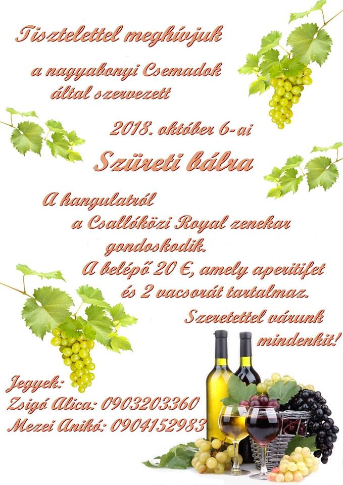 Nagyabonyban október 6-án, szombaton szüreti bált rendeznek.