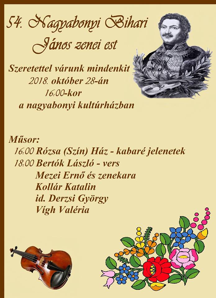 Nagyabonyban október 28-án, vasárnap 16.00 órától kerül sor az 54. Nagyabonyi Bihari János zenei est.