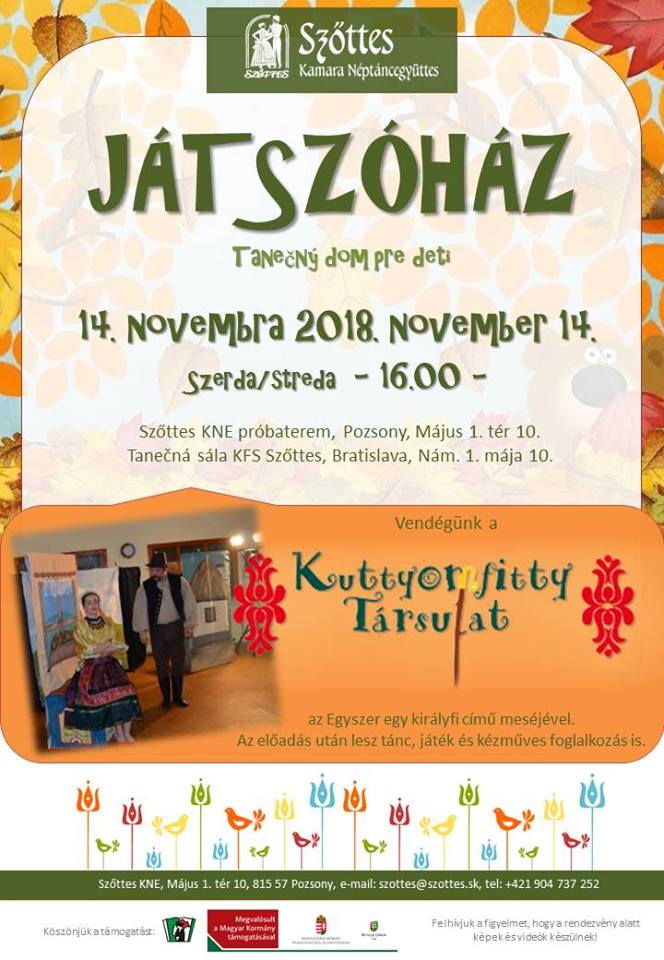 A Szőttes Kamara Néptáncegyüttes november 14-én, szerdán 16.00 órától rendezi meg a Szőttes játszóházat a néptáncegyüttes pozsonyi próbatermében (Május 1. tér 10.). Vendégük a Kuttyomfitty Társulat az Egyszer egy királyi meséjével.