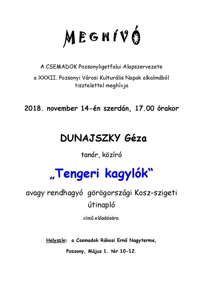 A Csemadok Pozsonyligetfalui Alapszervezete a XXXII. Pozsonyi Kulturális Városi Napok alkalmából november 14-én, szerdán 17.00 órától szervezi meg Dunajszky Géza tanár, közíró Tengeri kagylók, avagy rendhagyó görögországi Kosz-szigeti utinapoló című előadását a Csemadok Rákosi Ernő Nagytermében (Május 1. tér 10–12.).