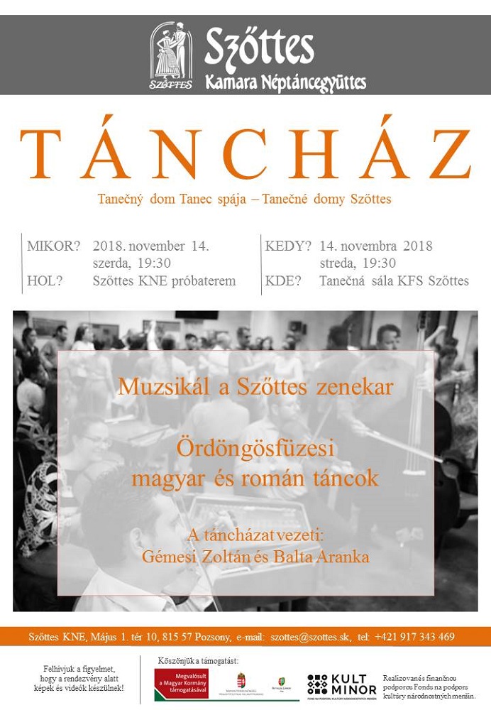 A Szőttes Kamara Néptáncegyüttes november 14-én, szerdán 19.30 órai kezdettel rendezi meg a táncházát a Szőttes KNE pozsonyi próbatermében.