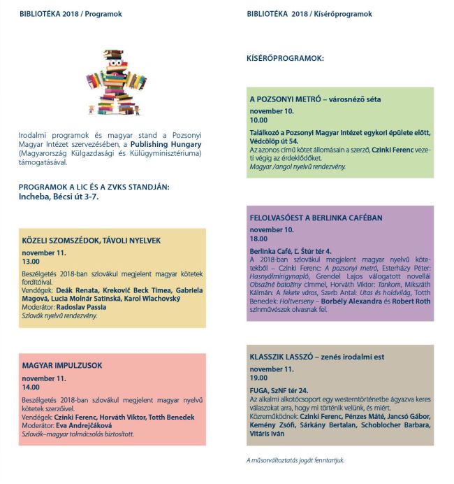 november 11., 14.00 – Magyar impulzusok – beszélgetés szerzőkkel (helyszín: LIC- és ZVKS Stand, Incheba, Bécsi út 3–7.)