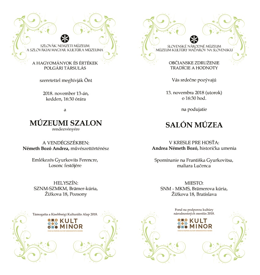 A Szlovák Nemzeti Múzeum – A Szlovákiai Magyar Kultúra Múzeuma és a Hagyományok és Értékek Polgári Társulás közösen szervezi meg november 13-án, kedden 16.30 kezdettel a Múzeumi Szalon következő rendezvényét a pozsonyi Brämer-kúriában (Žižkova 18.).