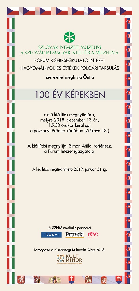 Szlovák Nemzeti Múzeum – A Szlovákiai Magyar Kultúra Múzeuma, a Fórum Kisebbségkutató Intézet és a Hagyományok és Értékek Polgári Társulás közösen szervezi meg december 13-án, csütörtökön 15.30 kezdettel a 100 év képekben című kiállítás megnyitóját a pozsonyi Brämer kúriában (Žižkova 18.).