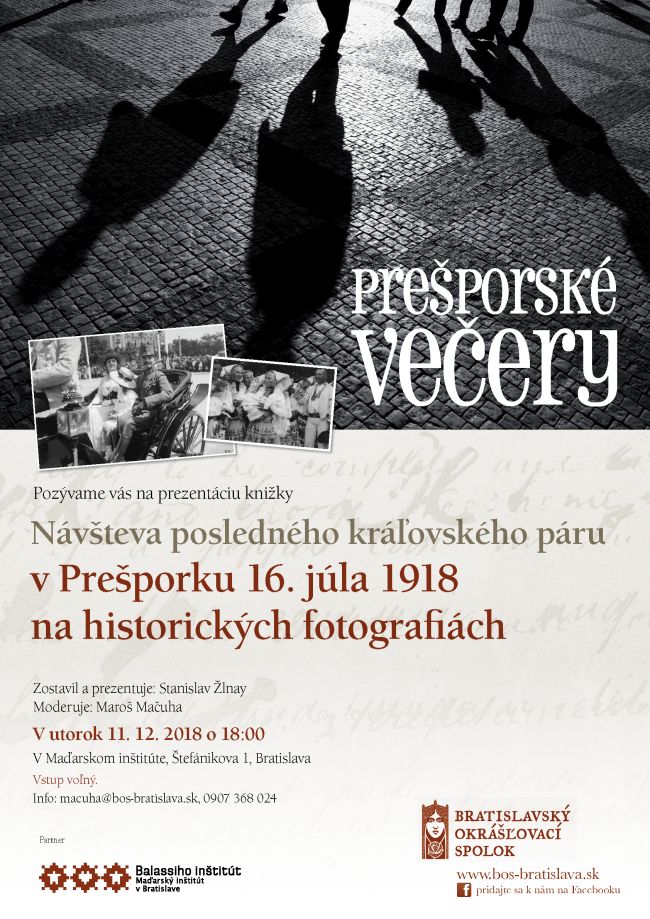 December 11-én, kedden 18.00 órától kerül bemutatásra Stanislav Žlany Návšteva poseldného kráľovského páru v Prešporku 16. júla 1918 na historických fotografiách c. könyvének bemutatása a Pozsonyi Magyar Intézetben (Štefánikova/Stefánia út 25.).