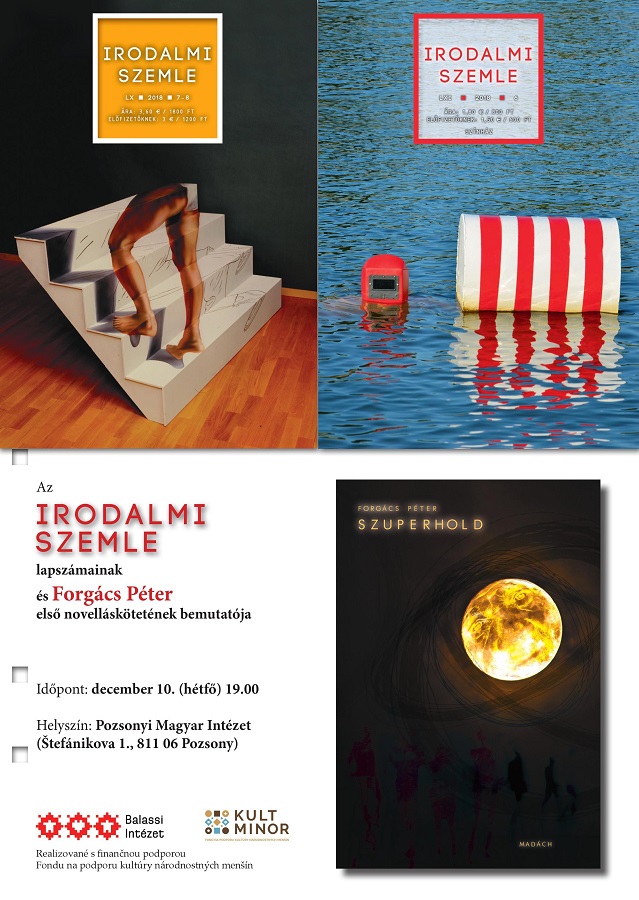 December 10-én, hétfőn 19.00 órai kezdettel rendezik meg az Irodalmi Szemle és Forgács Péter Szuperhold című novelláskötetének a bemutatóját a Pozsonyi Magyar Intézet épületében (Štefánikova/Stefánia út 1.).