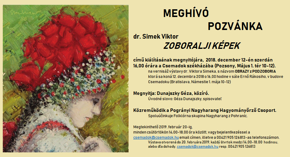December 12-én, szerdán 16.00 órai kezdettel rendezik meg dr. Simek Viktor Zoborlaji képek című kiállításának a megnyitóját a Csemadok székházában (Május 1. tér 10–12.).