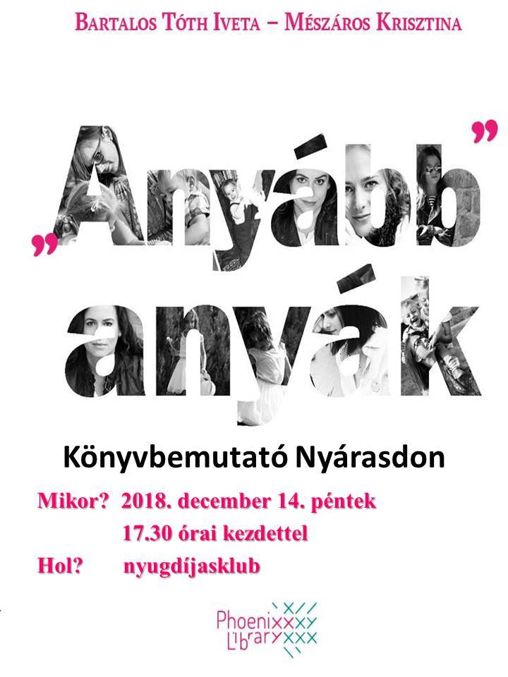 Nyárasdon december 14-én, pénteken 17.30 órai kezdettel Bartalos Tóth Iveta és Mészáros Krisztina bemutatják Anyább anyák c. könyvüket.