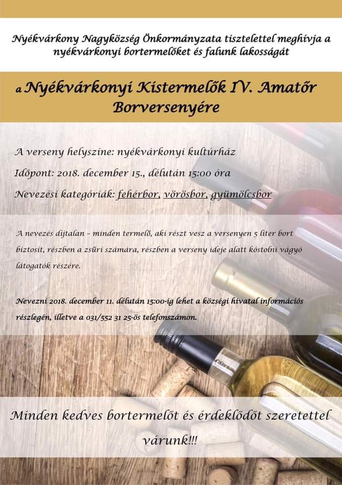 Nyékvárkony nagyközségben december 15-én, szombaton 15.00 órakor kezdődik  borverseny.