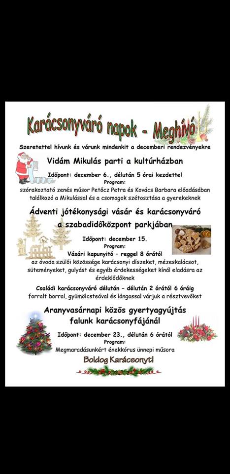 Nyárasdon december 14-én, pénteken adventi programokra kerül sor.