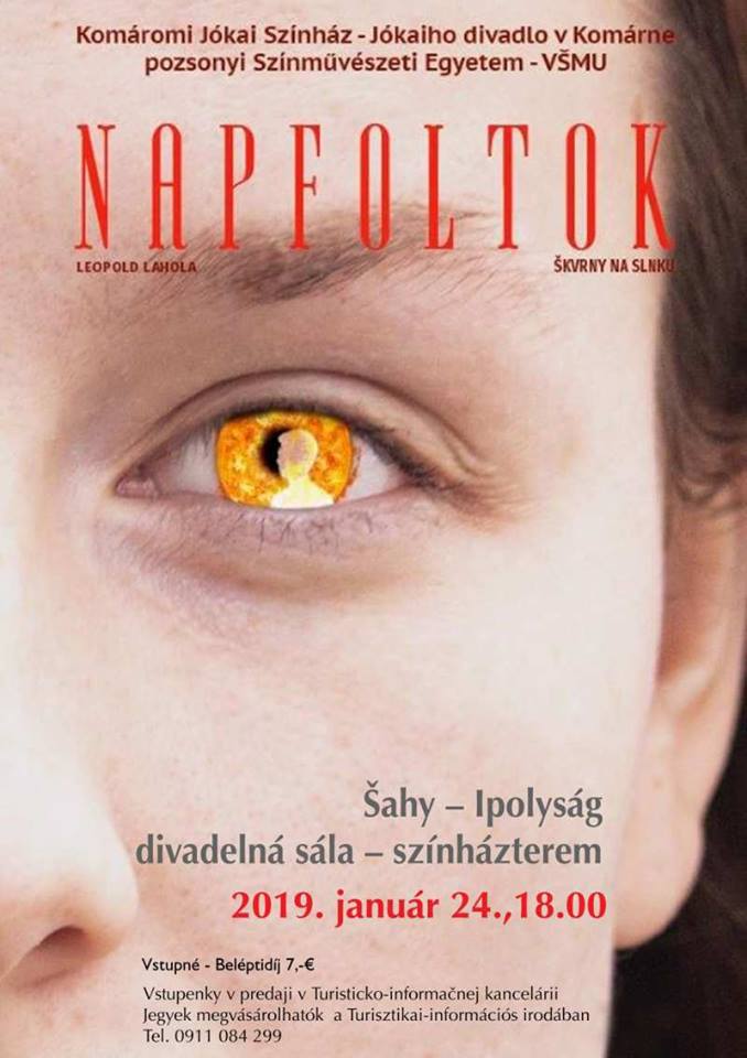 A komáromi Jókai Színház és a pozsonyi Színművészeti Egyetem január 24-én Ipolyságon adja elő Leopold Lahola Napfoltok című színpadi játékát.