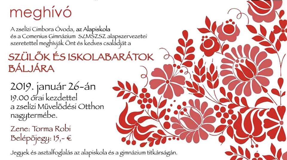 A zselízi Cimbora Óvoda, az Alapiskola és a Comenius Gimnázium SZMSZSZ alapszervezetei szeretettel meghívják Önt és kedves családját a Szülők és iskolabarátok báljára 2019. január 26-án 19 órai kezdettel a zselízi Művelődési Otthon nagytermébe.