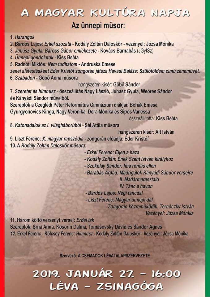 A Csemadok Lévai Alapszervezete tisztelettel meghívja Önt, kedves családját és barátait 2019. január 27-én, vasárnap 16 órakor A magyar kultúra napja alkalmából rendezett irodalmi és zenei összeállításra.
