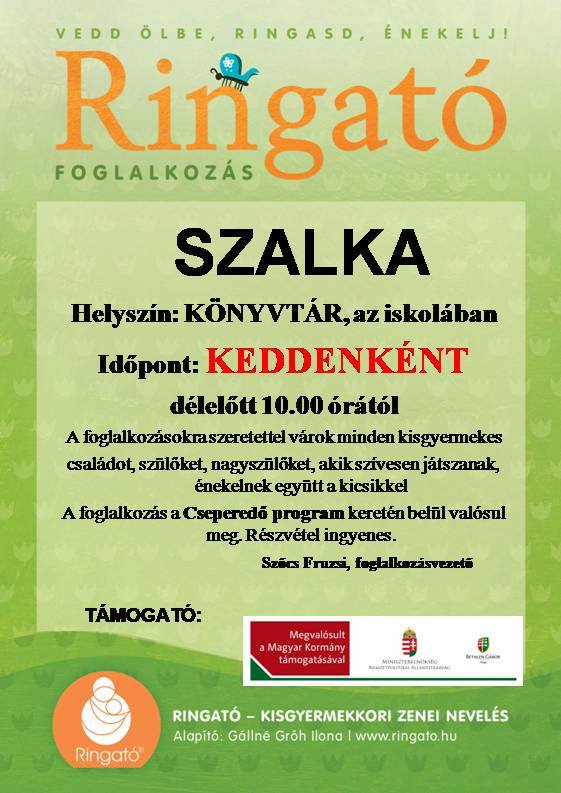 Szalka községben január 29-én, kedden 10.00 órakor kezdődik a Ringató foglalkozás.